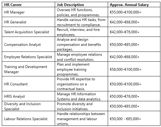 Have a look at the table below of some HR careers available and their approximate annual salaries.