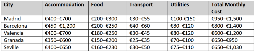- Social Life in Spain: Spain’s social culture is integral to the student experience. Budget around €100 to €300 monthly for cultural activities, travel, entertainment, and social events to fully embrace Spanish student life.