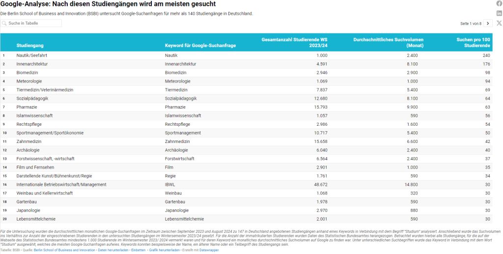Die Vorlesungszeit des Wintersemesters 2024/25 hat begonnen und zahlreiche Studierende starten in ihr erstes Semester. Das Angebot in Deutschland ist vielfältig: Doch welcher Studiengang ist am gefragtesten und wie viele Studierende schreiben sich am Ende tatsächlich dafür ein? Für die Suche nach dem richtigen Studienfach wird im ersten Schritt oftmals gegoogelt. Wir bei der BSBI untersuchten daher die Google-Suchanfragen von 147 Studiengängen und setzten diese ins Verhältnis zur Studierendenanzahl im Wintersemester 23/24 laut Statistischem Bundesamt.