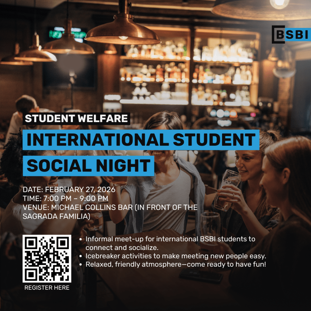 We would like to invite all BSBI students to an informal get-together designed to connect, socialise, and get to know one another in a relaxed setting. During the meet-up, students will take part in light activities aimed at breaking the ice and helping conversations flow naturally.