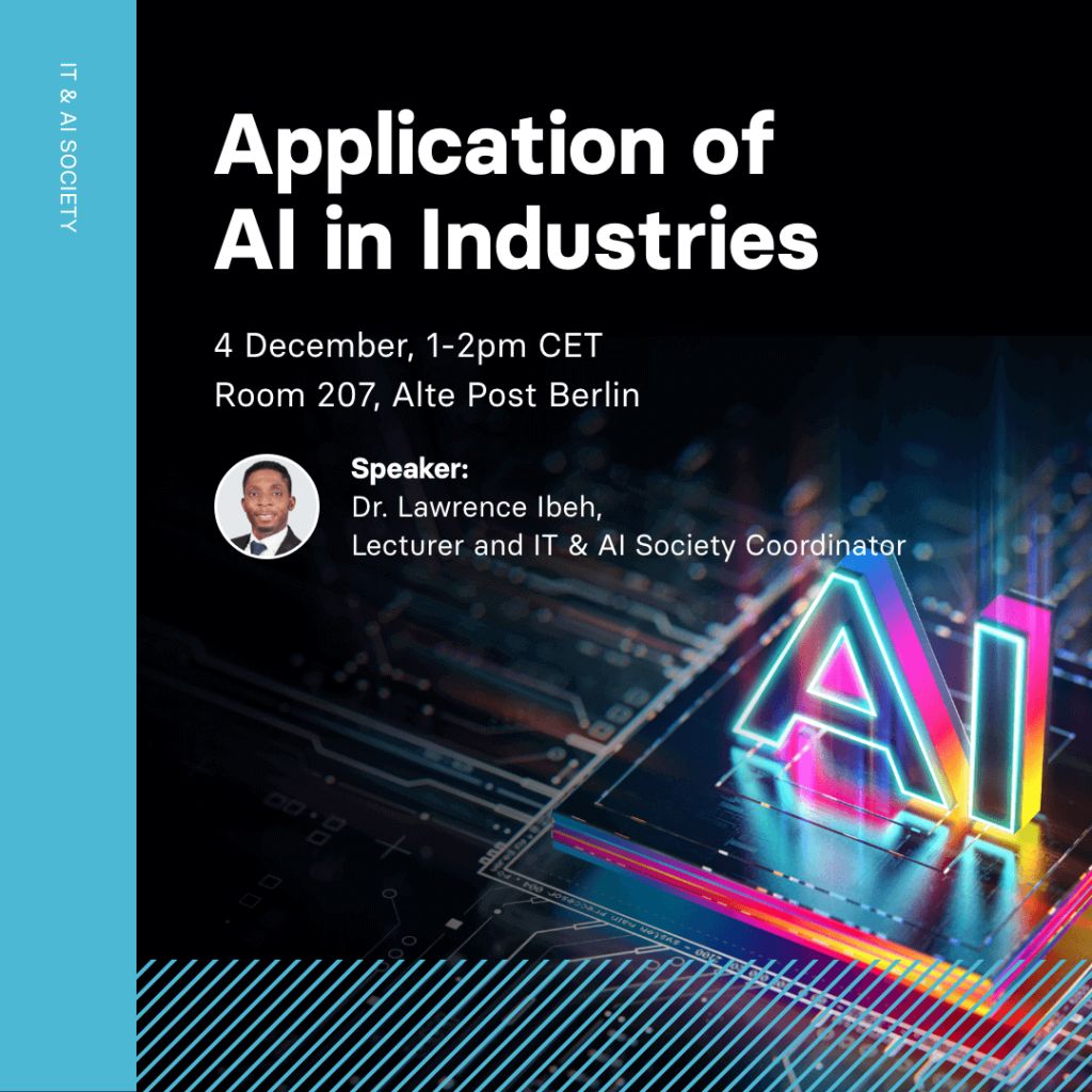 The BSBI IT and AI Society invites you to the upcoming workshop on “Application of AI in Industries,” scheduled on 4 December. The workshop will be led by Dr Lawrence Ibeh, Lecturer and IT and AI Society Coordinator, who will provide you with the latest trends, advancements, real-world use cases of AI, and future prospects of AI’s integration across diverse fields.