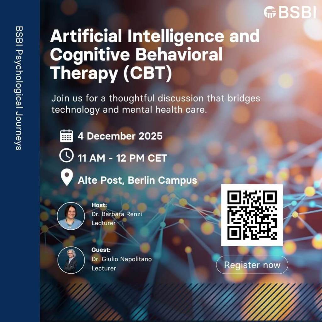In this upcoming session of Psychological Journeys, Dr. Barbara G. Renzi, Lecturer, will host Dr. Giulio Napolitano, Course Board Chairperson of the MSc in Artificial Intelligence and member of the Faculty Board of Computer Science at BSBI, for a deep exploration of “AI and Cognitive Behavioral Therapy: A Dialogue Between Technology and the Mind.”