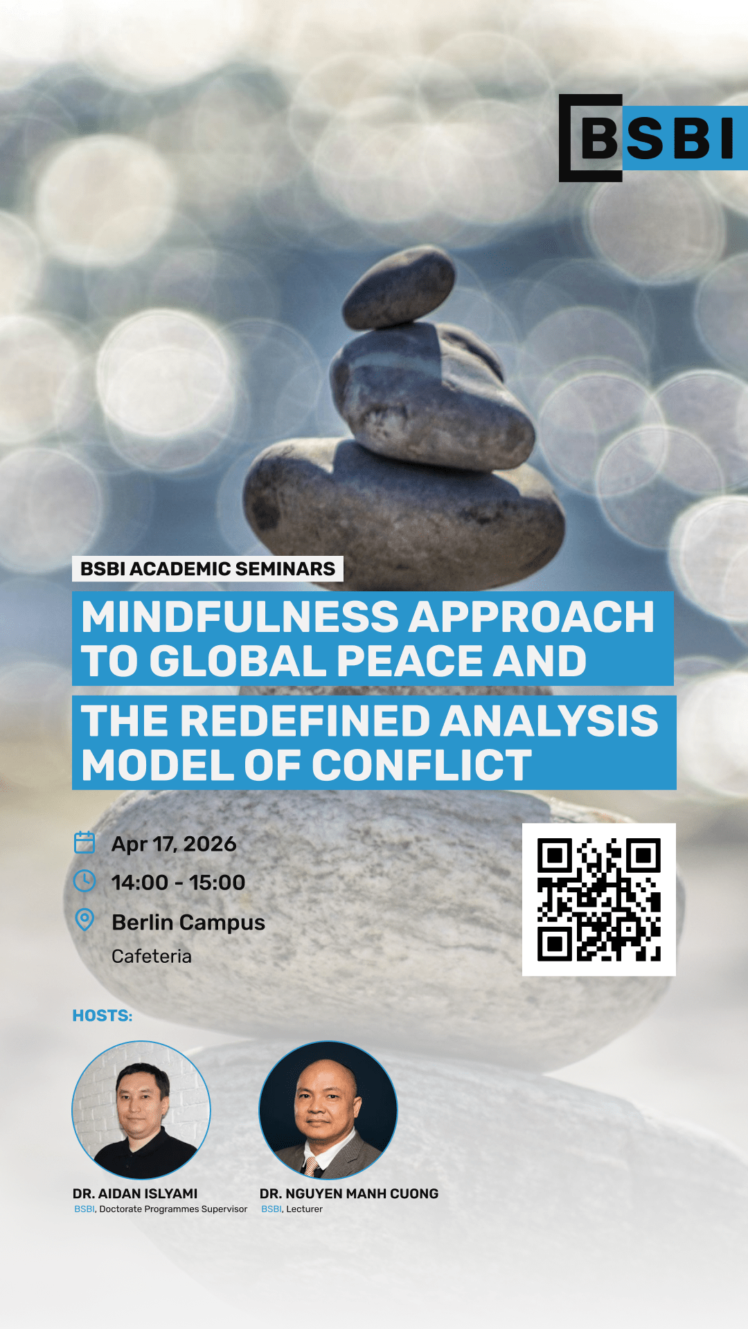 The BSBI Academic Seminar presents Mindfulness Approach to Global Peace and the Redefined Analysis Model of Conflict. This session explores how mindfulness can reshape our understanding of conflict and contribute to sustainable global peace. By integrating psychological awareness with contemporary conflict analysis, the seminar introduces a redefined model that emphasizes empathy, self-regulation, and deeper perception of underlying tensions. Participants will gain insights into how mindful practices can transform both personal and collective responses to conflict. Ideal for students, academics, and professionals, the seminar offers a fresh, reflective perspective on building more peaceful and constructive global interactions.