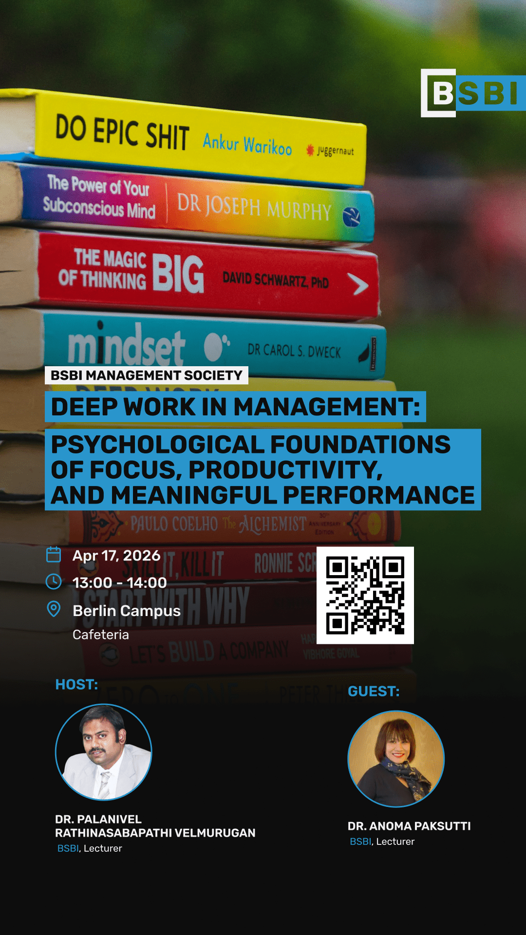 The BSBI Management Society presents Deep Work in Management: Psychological Foundations of Focus, Productivity, and Meaningful Performance. This event explores how managers and professionals can cultivate sustained focus in an increasingly distracted world. Drawing on psychological research, it highlights the principles behind deep work, its impact on productivity, and its role in achieving meaningful, high-quality outcomes. Participants will gain practical insights into managing attention, reducing cognitive overload, and building habits that support long-term performance. Ideal for students and aspiring leaders, the session offers valuable tools to enhance both personal effectiveness and professional success in modern management environments.