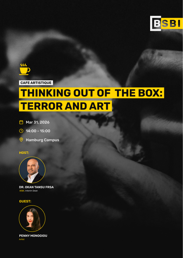 Café Artistique with Penny Monogiou “Thinking Out of the Box: Terror and Art,” In this new episode of Café Artistique, hosting Penny Monogiou to speak on “Thinking Out of the Box: Terror and Art,” offers our students and the audience, a unique and focused learning experience that directly connects artistic practice with complex contemporary realities. Through her body of work, Monogiou demonstrates how emotionally charged themes such as fear, power, distortion, and vulnerability can be transformed into a coherent visual language. By analyzing her artistic process in relation to the theme of terror, students will gain concrete insight into how difficult and sensitive subjects can be approached with conceptual clarity rather than sensationalism. During this session, students and all the audience will not only observe finished artworks, but also engage with the thinking behind them. Understanding why certain aesthetic decisions are made, how symbolism is constructed, and how emotional intensity is balanced with artistic control will strengthen their own ability to develop deeper and more intentional creative concepts. This edition of Café Artistique will challenge students to reconsider the boundaries of comfort in their own work. Seeing how an artist confronts unsettling themes encourages them to move beyond safe design solutions and to explore more courageous, research-driven, and socially aware approaches. It will push them to ask stronger conceptual questions and to justify their creative choices more rigorously. Additionally, discussing terror as a broader psychological and societal condition rather than only as political violence helps students expand their interpretative frameworks. This directly enhances their ability to think critically, contextualize their projects, and connect creative production with cultural discourse. In this specific context, the presence of Penny Monogiou becomes an active learning moment. It provides our students with a real example of how art can engage with tension and complexity without losing aesthetic strength. This experience supports their development as thoughtful, conceptually grounded, and professionally mature creatives within the Faculty of Creative Industries.