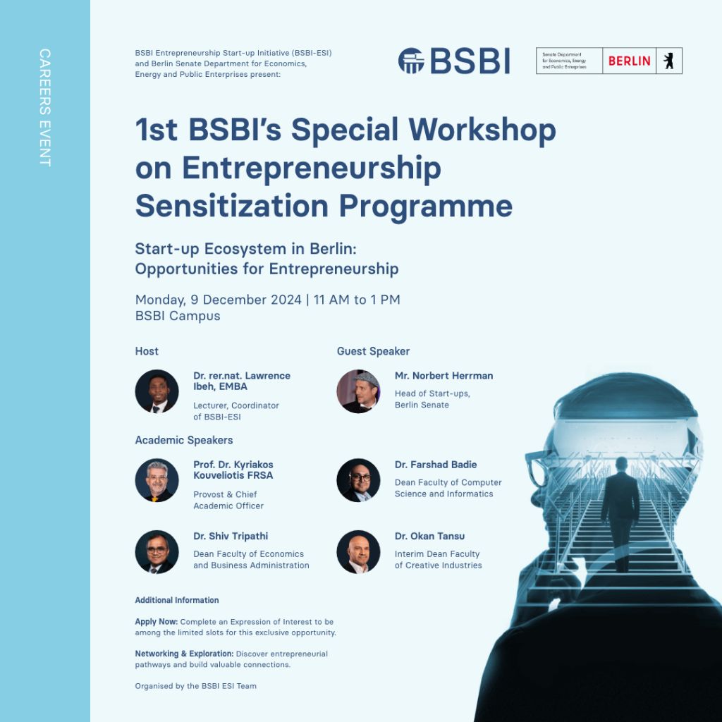 he 1st Special Workshop on Entrepreneurship Sensitization Programme, presented by the BSBI Entrepreneurship Start-up Initiative (BSBI-ESI) and the Berlin Senate Department for Economic Affairs and Public Enterprises, invites you to explore the Start-up Ecosystem in Berlin: Opportunities for Entrepreneurship. Taking place on Monday, 9th December 2024, from 11AM to 1PM at the BSBI Alte Post Campus, Berlin, this event offers a unique opportunity to delve into one of Europe’s most dynamic start-up hubs.