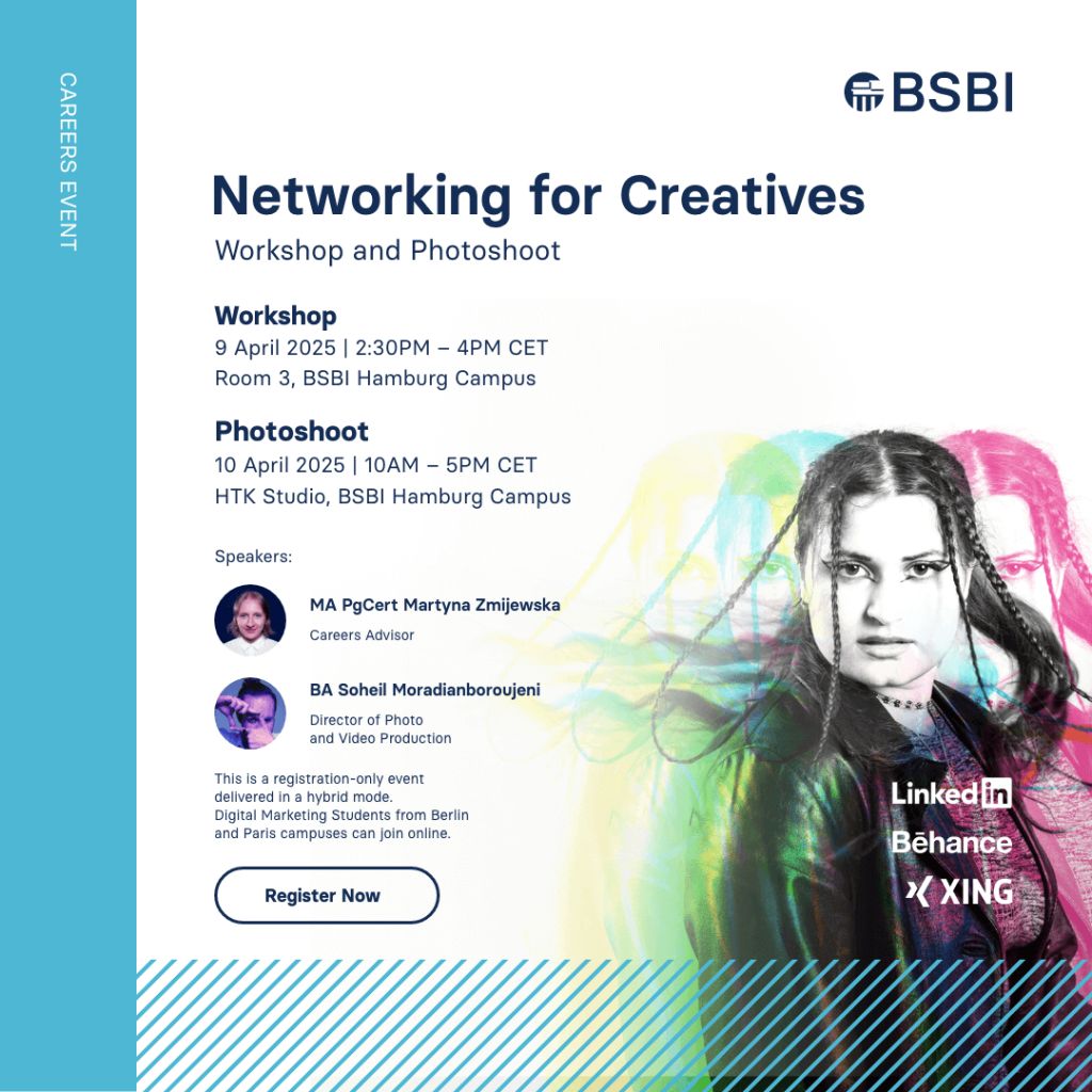 An integral part of every good online account is a professional profile picture. As part of the workshop, you will have the opportunity to have a personal image taken by BSBI Photo and Video Production team on the following day (10 April) and use it on your newly revamped LinkedIn or Behance.