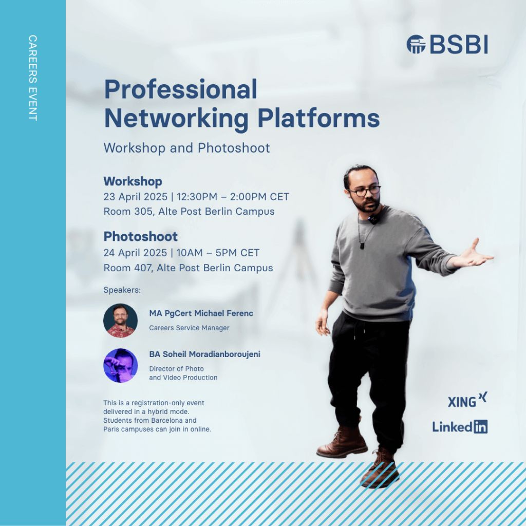 An integral part of every good online account is a professional profile picture. As part of the workshop, you will have the opportunity to have a personal image taken by BSBI Photo and Video Production team on the following day (24.04) and use it on your newly revamped LinkedIn or XING.