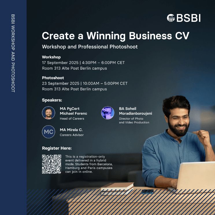 A strong CV or LinkedIn profile isn’t complete without a professional image. That’s why BSBI’s Photo and Video Production team will be offering 15-minute personal photoshoots exclusively for workshop participants.