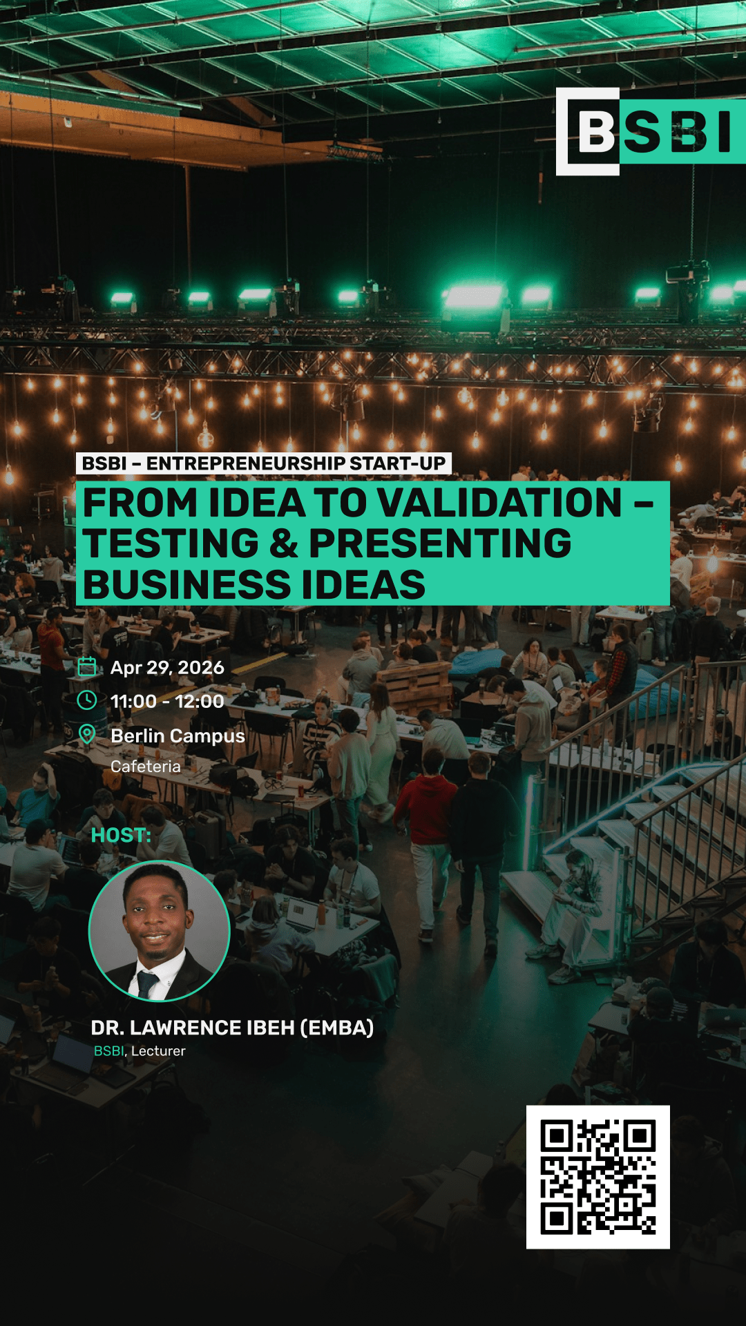 Do you have a business idea but are unsure how to test whether it can really work? Join this engaging BSBI Entrepreneurship Start-up session designed to help students and faculty explore the journey from idea generation to validation. This event will focus on how to assess the potential of a business idea, test its relevance in the real world, and present it clearly and confidently to others. Participants will gain practical insights into validating assumptions, refining value propositions, and communicating ideas in a compelling way. Whether you are already developing a start-up concept or simply interested in innovation and entrepreneurship, this session offers a valuable opportunity to learn, be inspired, and strengthen your entrepreneurial thinking. Be part of the conversation and take a step closer to turning ideas into viable opportunities.