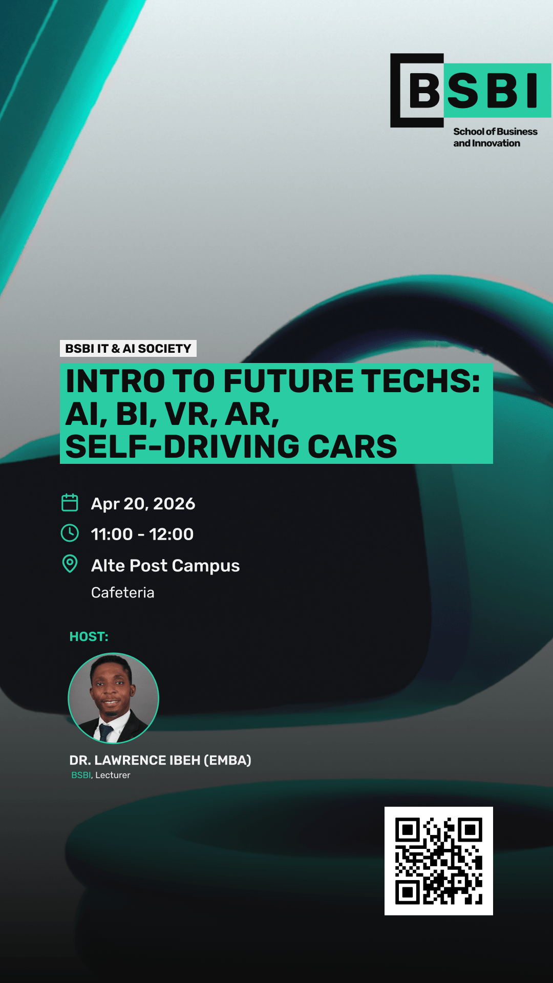 The BSBI IT & AI Society presents Intro to Future Techs: AI, BI, VR, AR, Self-Driving Cars. This session offers an engaging overview of the technologies shaping the future of industries and everyday life. From artificial intelligence and business intelligence to immersive realities and autonomous mobility, participants will explore how these innovations are transforming decision-making, communication, and transportation. The seminar combines foundational concepts with real-world applications, making complex technologies accessible and relevant. Ideal for students and tech enthusiasts, it provides a forward-looking perspective on emerging trends and the skills needed to thrive in a rapidly evolving digital world.