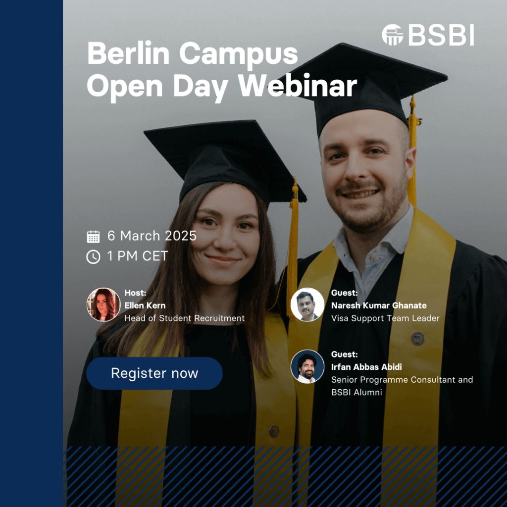 Join our Berlin Campus Open Day Webinar on Friday, 6 March, at 1 PM CET to learn about BSBI’s admission process, funding options, and career support services designed to boost your professional journey.