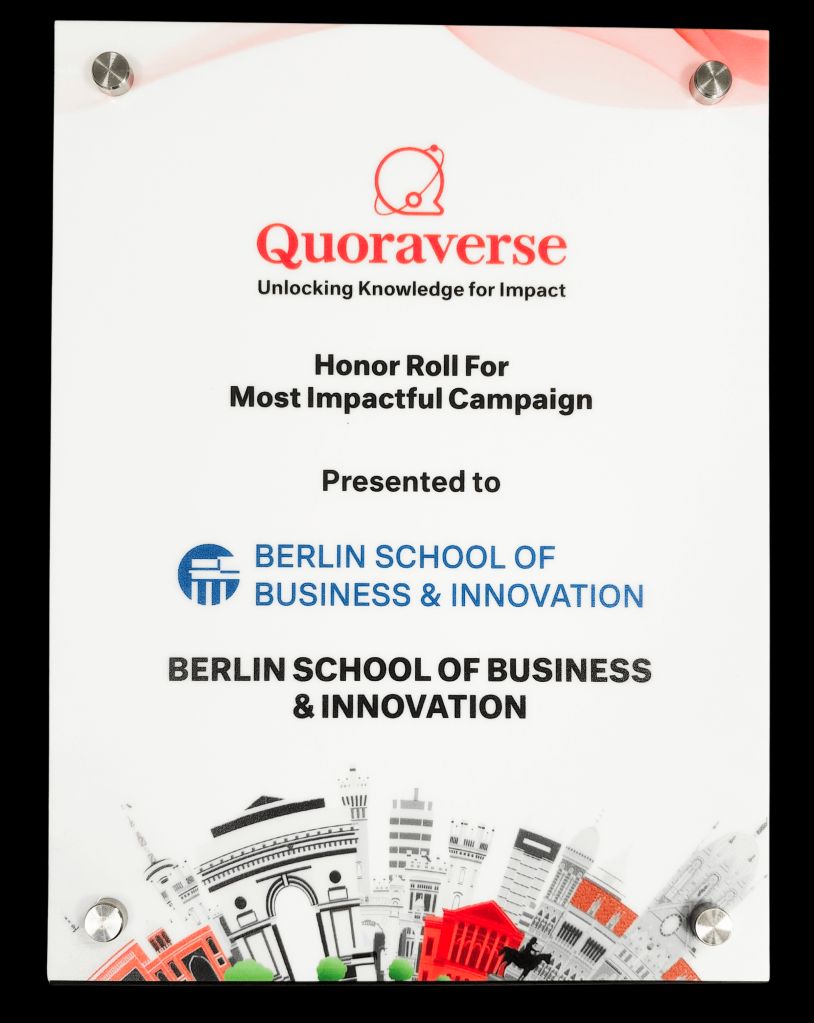 The Berlin School of Business and Innovation (BSBI) has been recognised with the prestigious Honor Roll for Most Impactful Campaign on Quora at the Quoraverse: Unlocking Knowledge for Impact event. The event, held last 28 November 2024 at the Hyatt Centric MG Road in Bangalore, brought together industry leaders and marketing professionals to explore emerging trends, share strategies, and foster meaningful collaborations.