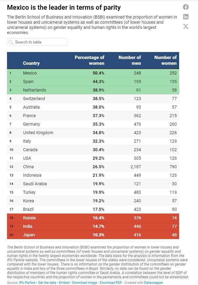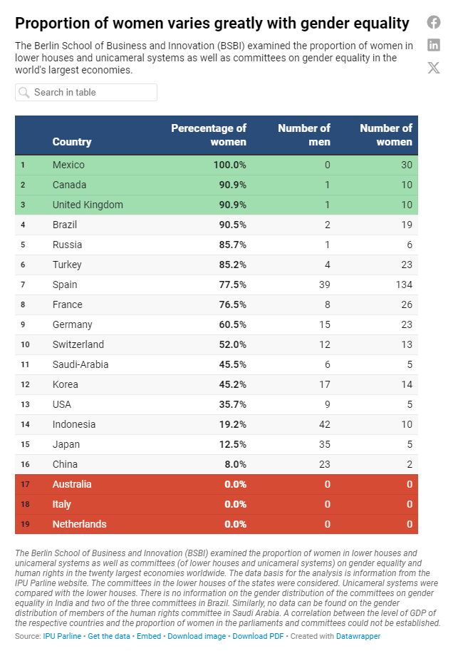 We at the Berlin School of Business and Innovation have examined the gender parity in the lower houses of parliament and parliaments, as well as in the bodies and committees on human rights and gender equality in the twenty countries with the highest gross domestic product. The data source was the IPU Parline website, a reference point for authoritative data on the world’s parliaments.