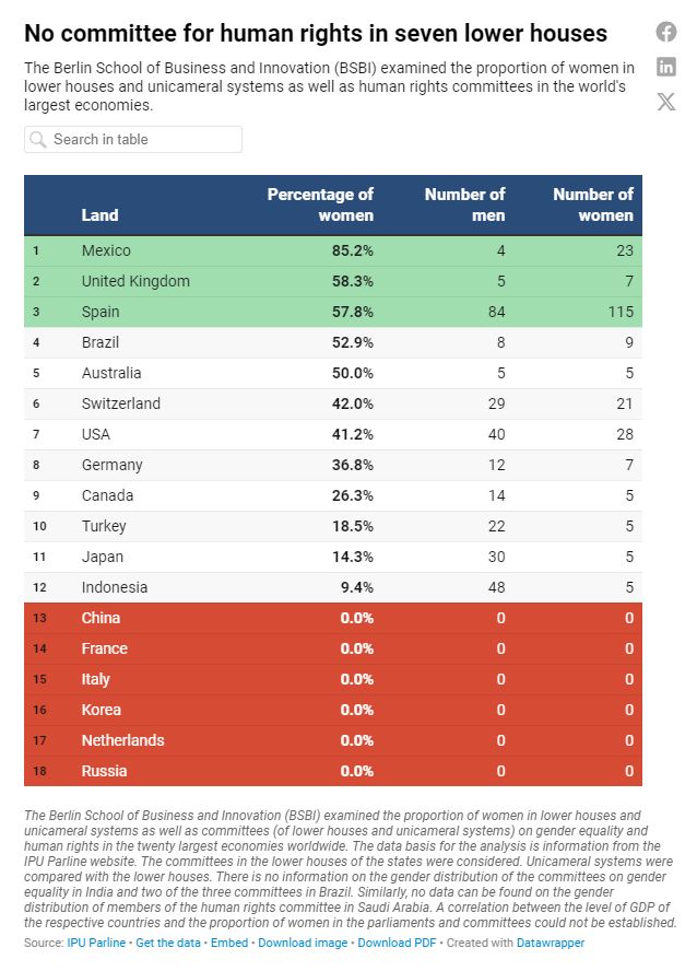 The Berlin School of Business and Innovation (BSBI) analysed the proportion of women in lower houses and unicameral systems as well as committees (of lower houses and unicameral systems) on gender equality and human rights in the twenty largest economies worldwide. The data basis for the analysis is information from the IPU Parline website. The committees in the lower houses of the states were analysed. Unicameral systems were compared with the lower houses. There is no information on the gender distribution of the committees on gender equality in India and two of the three committees in Brazil. Similarly, no data can be found on the gender distribution of members of the human rights committee in Saudi Arabia. A correlation between the level of GDP of the respective countries and the proportion of women in the parliaments and committees could not be established.