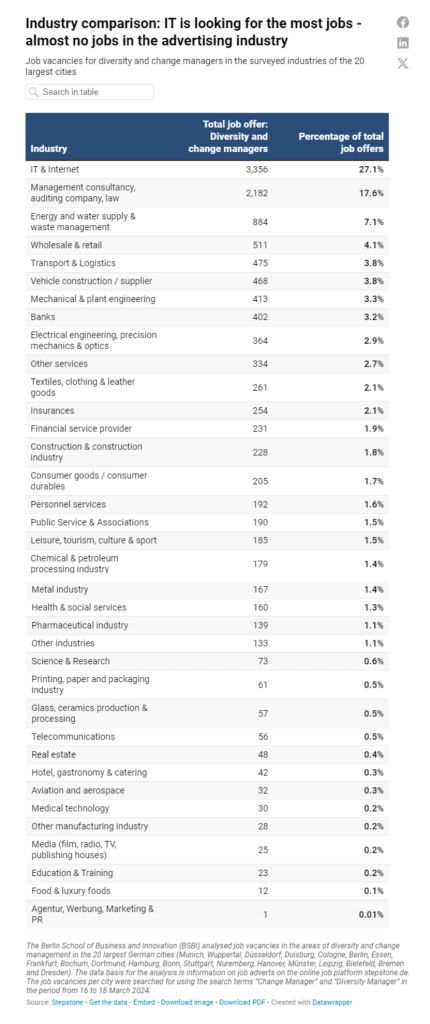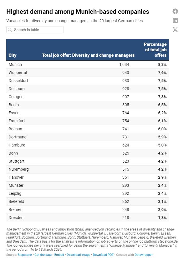 The Berlin School of Business and Innovation (BSBI) analysed job vacancies in the areas of diversity and change management in the 20 largest German cities (Munich, Wuppertal, Düsseldorf, Duisburg, Cologne, Berlin, Essen, Frankfurt, Bochum, Dortmund, Hamburg, Bonn, Stuttgart, Nuremberg, Hanover, Münster, Leipzig, Bielefeld, Bremen and Dresden). The data basis for the analysis is information on job adverts on the online job platform stepstone.de. The job vacancies per city were searched for using the search terms “Change Manager” and “Diversity Manager” in the period from 16 to 18 March 2024.